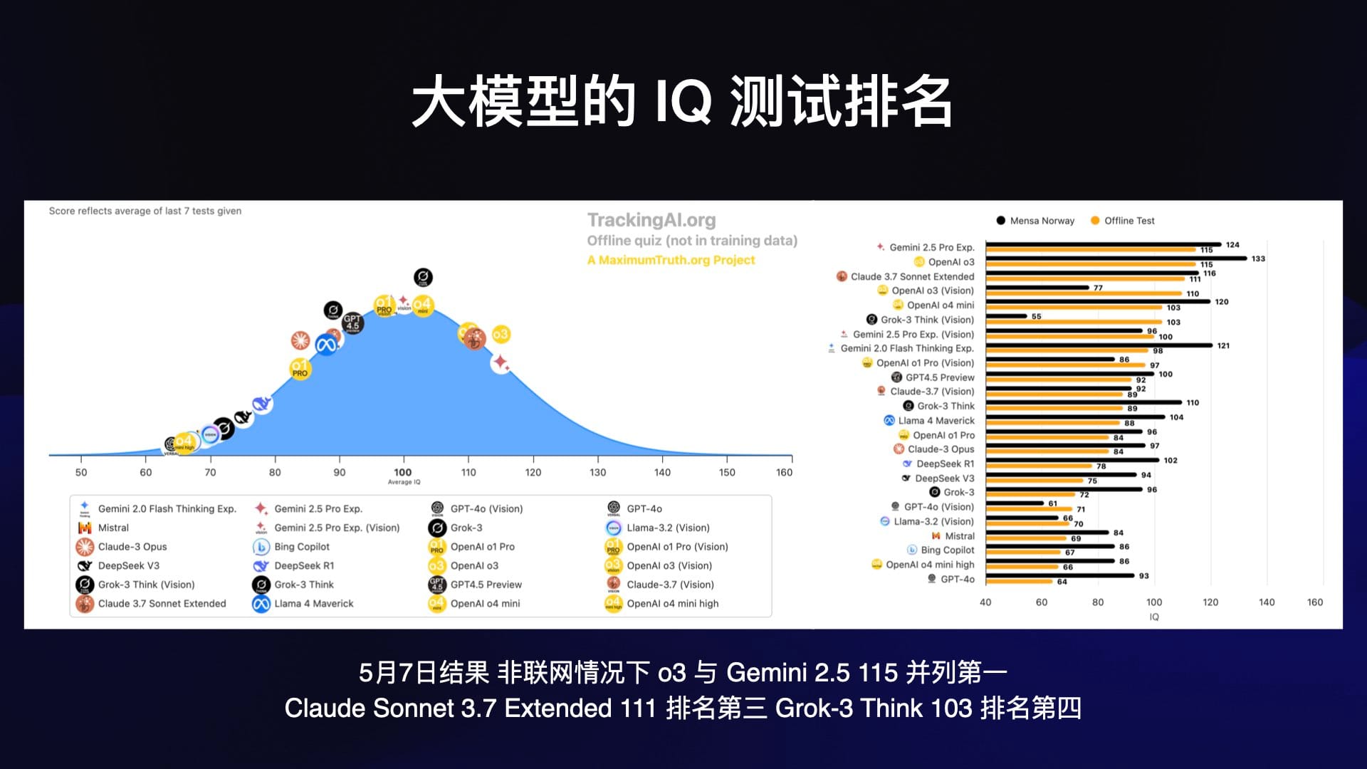 通过非正式的“大模型 IQ 测试”,结果显示,离线状态下,OpenAI 的 O3 和 Google Gemini 2.5 智商在 115 左右,并列第一;Claude 紧随其后,而 Grok-3 稍逊一筹。但若接入互联网,O3 马上飙到 130+,这表明多工具、多资源协同的威力。
