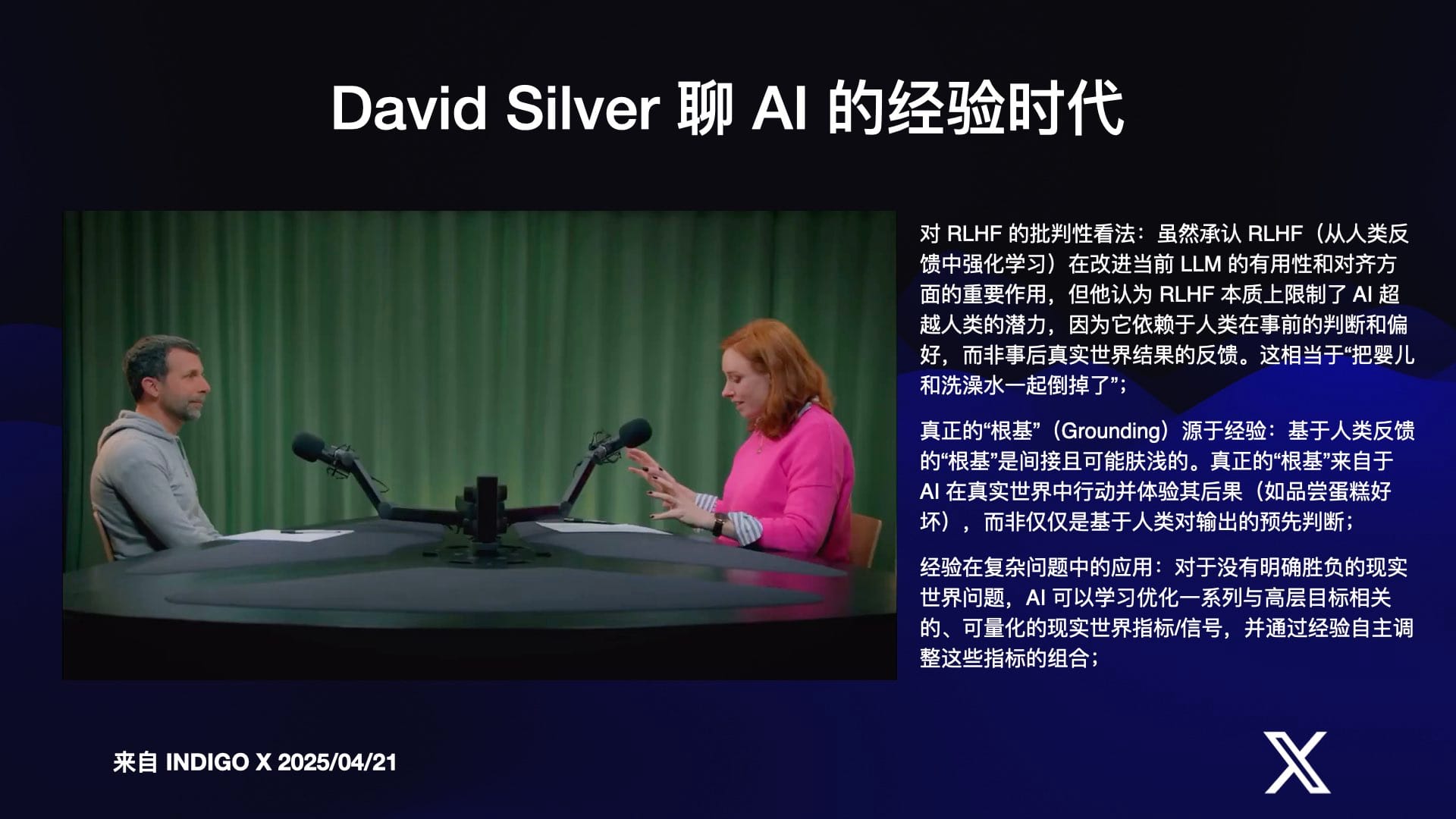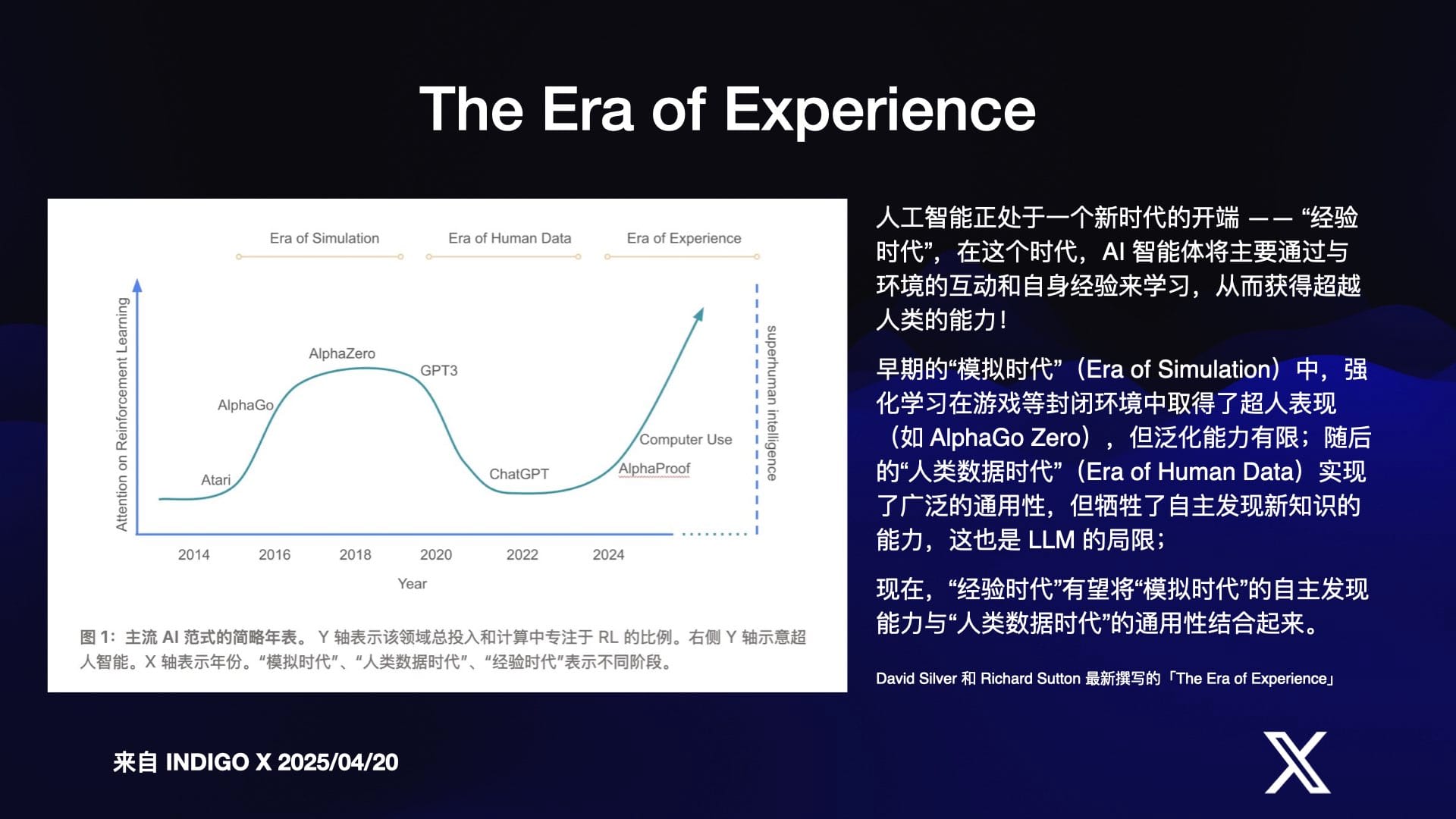 强化学习教父萨顿(Sutton)和 DeepMind 的高级研究员 David Silver 的团队提出了一个“经验时代”概念:在现实环境或高保真模拟里,让 AI 自己四处探索、犯错、改进,才能催生真正的创造力。