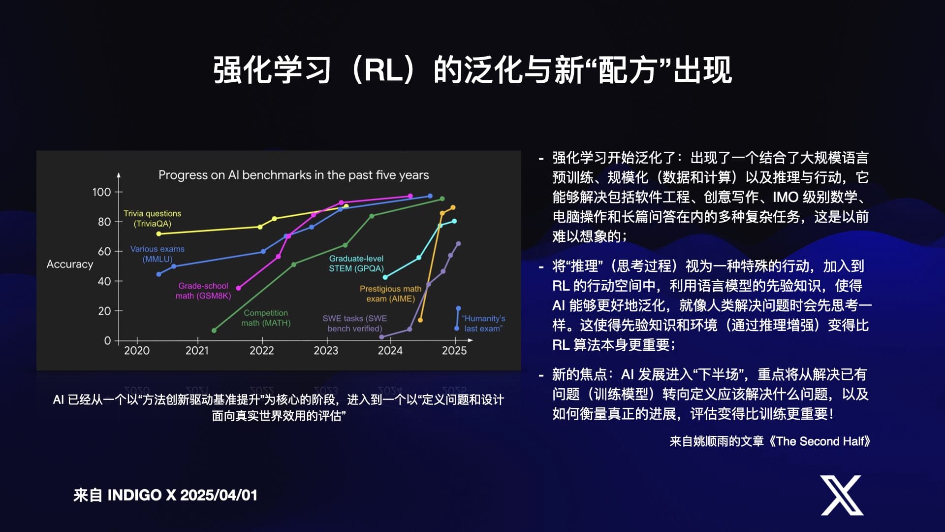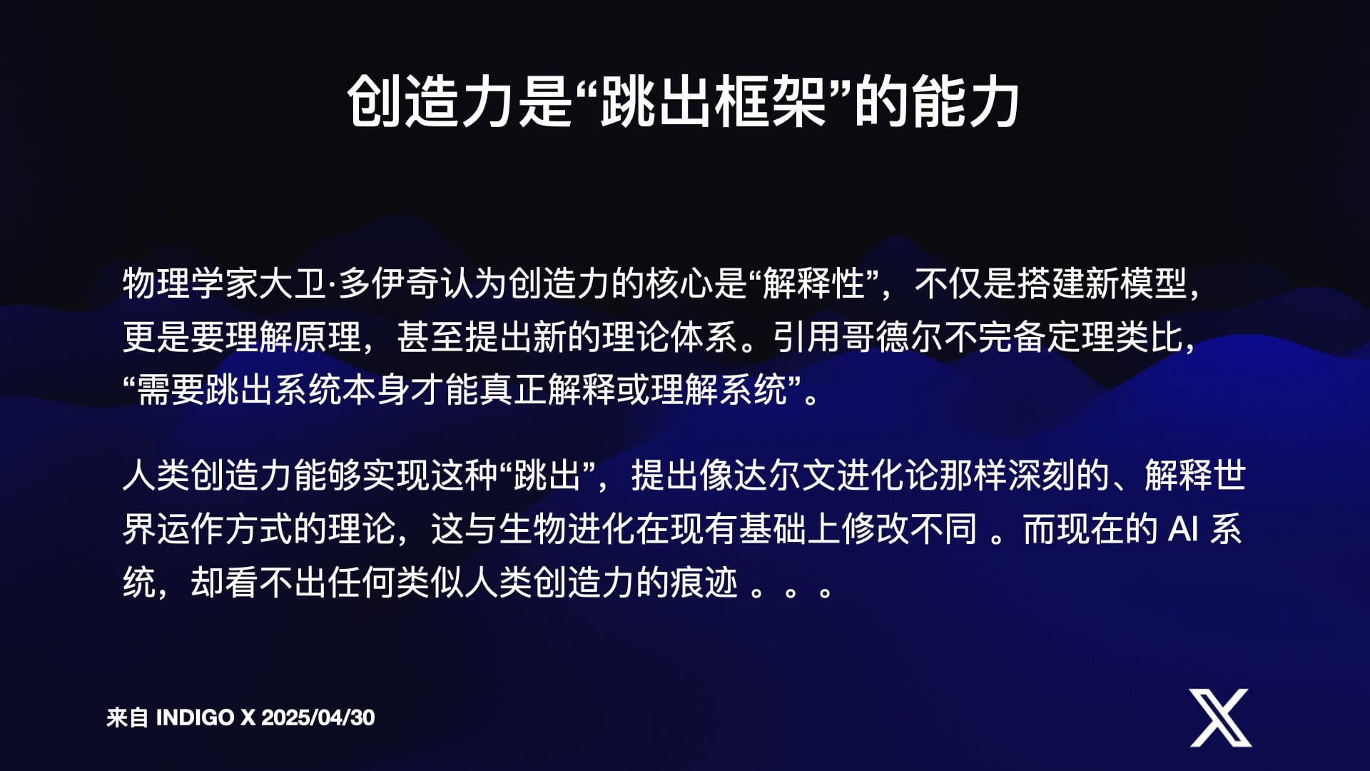 本期 INDIGO 月末直播带大家回顾全球关税大战背景下的 AI 与科技进展:Nvidia GTC 发布全栈 AI 电脑,Google TPU 刷新超算纪录;O3 与 Gemini 2.5 挑战人类 IQ 测试,AI 下半场进入“经验”时代,自主智能体与垂直 Agent 商机涌现。世界在川普百天新政与“黑暗启蒙”思潮的交织下,全球格局暗涌。最后,分享了写作与创造力之于个人跃迁的价值!全场 100 分钟,干后满满 😄