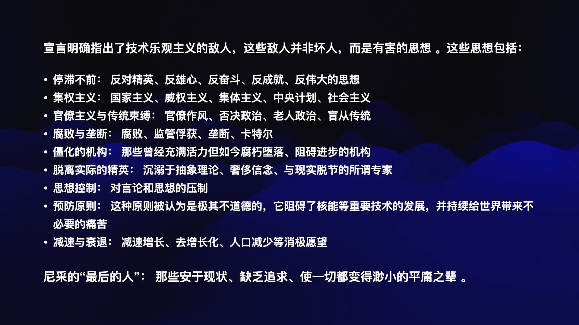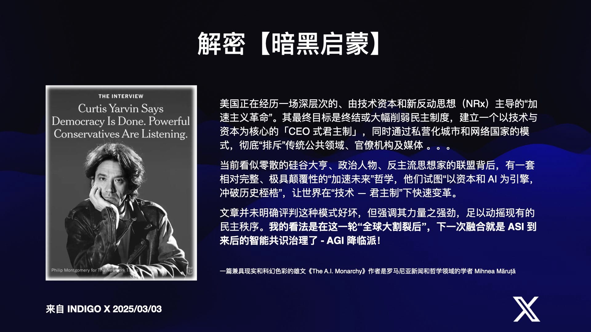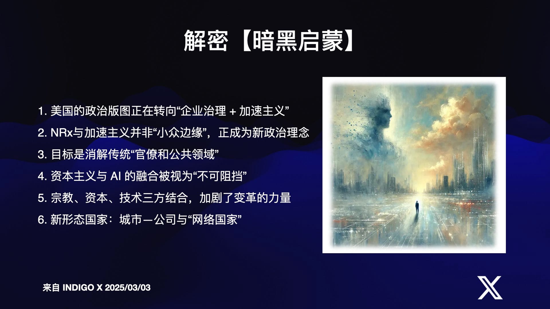 与此同时,一些硅谷思想家(被称为“黑暗启蒙”或“NRx”派系),比如 Peter Thiel 等,正主张建立以资本与技术主导的社会结构。他们认为政府官僚会拖慢技术进程,最好把权力更多交给“企业家君主”,把公共领域私营化乃至创建“网络城市”。