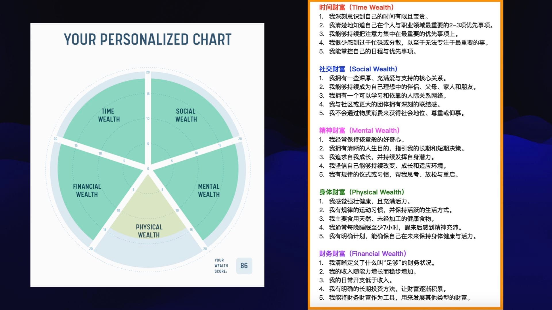 时间、社交、精神、身体与财务;并强调平衡这些维度的重要性。