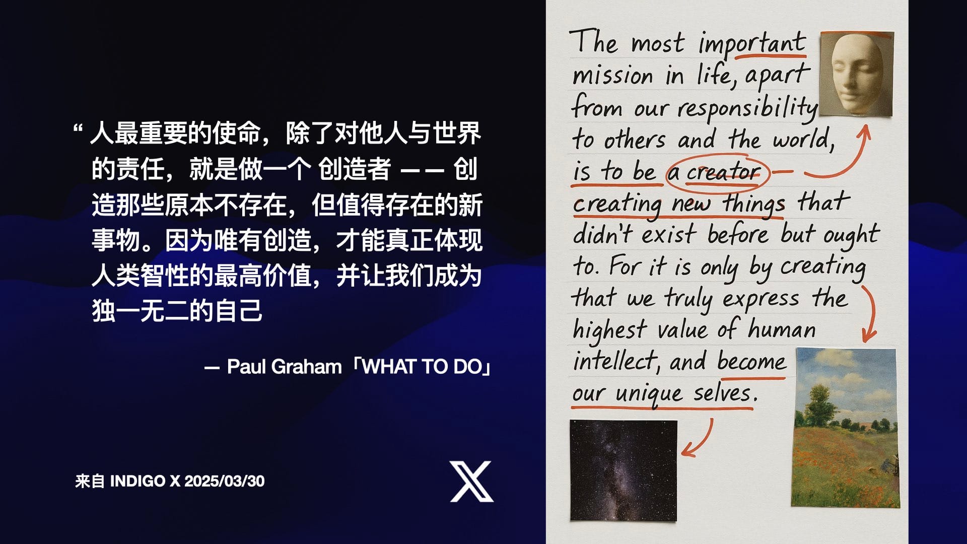 但也正是在剧烈变动里,我们更需要找回“创造者”的初心:敢于尝试,专注输出,站在更广阔的现实世界中,不断探索未知,让 AI 成为锦上添花的帮手,而非迷失自我的桎梏。