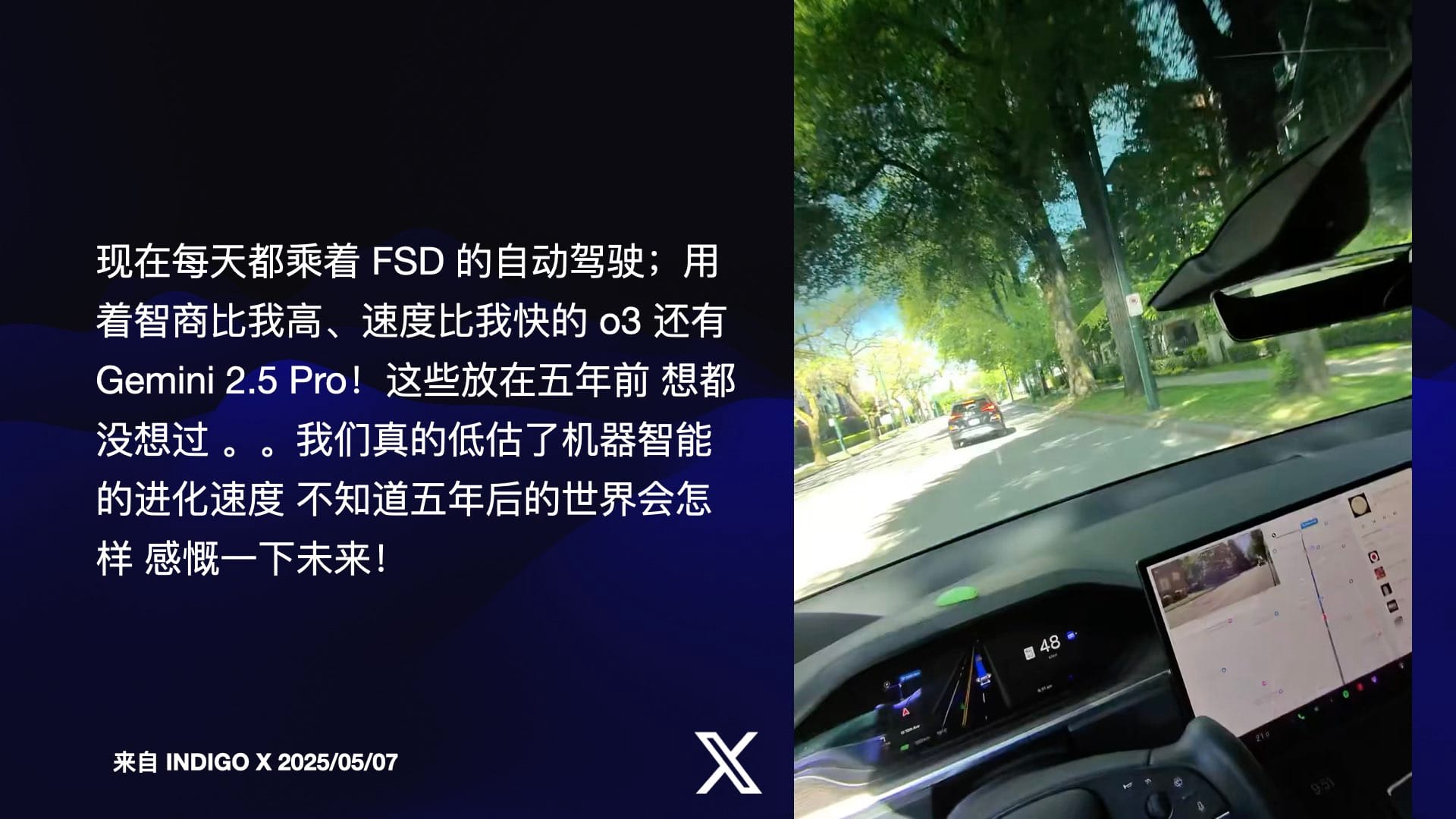为了让听众直观感受到这种加速,indigo 分享了一个极具冲击力的个人经历。他展示了一段自己使用智能眼镜录制的视频,画面中车辆正在完全自动驾驶(FSD)。