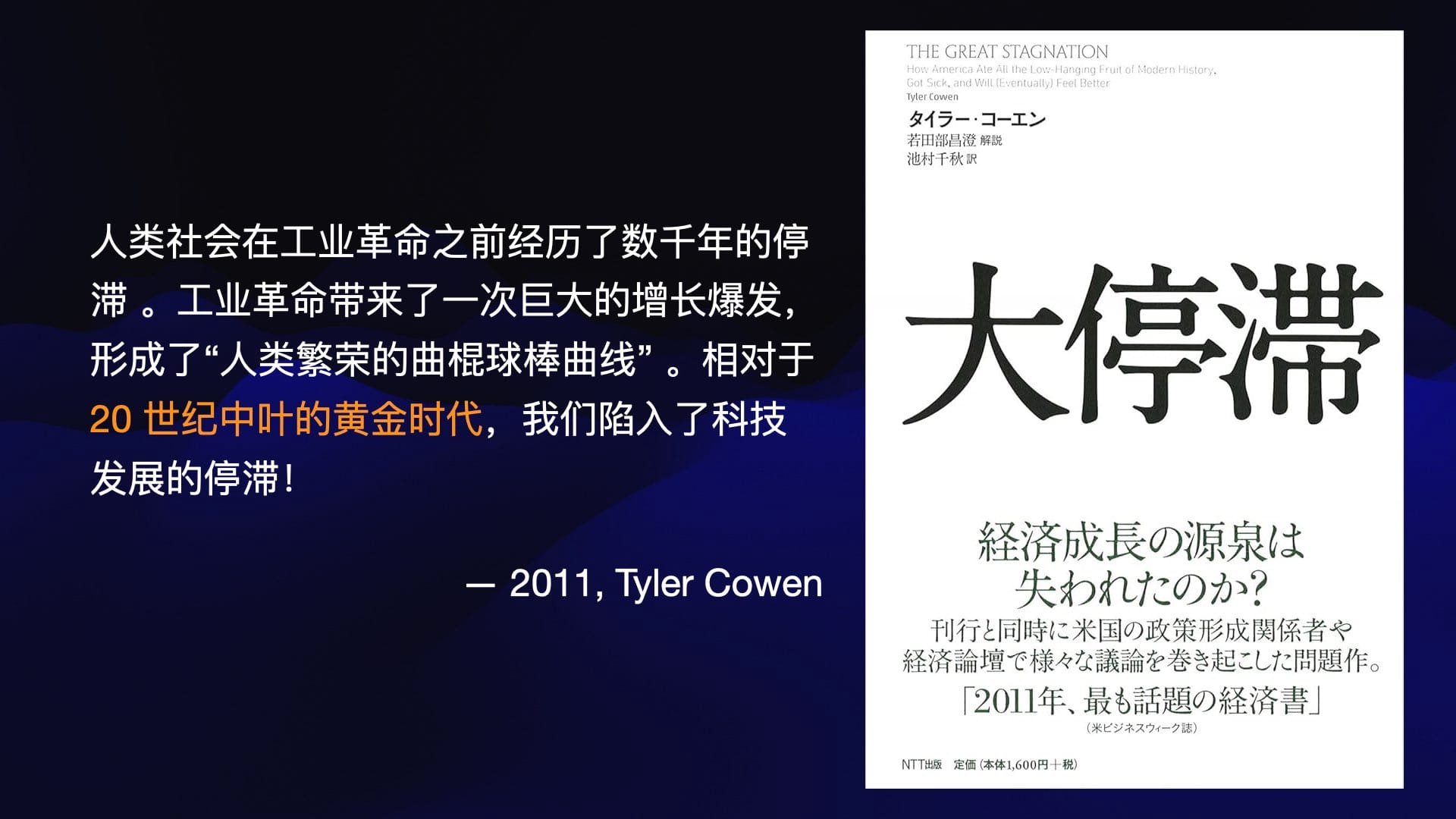 深度阐述 为了理解当前的“加速”,indigo 首先回顾了“减速”的时代。他引入了经济学家泰勒·考恩(Tyler Cowen)在 2011 年出版的著作《大停滞》(The Great Stagnation)。