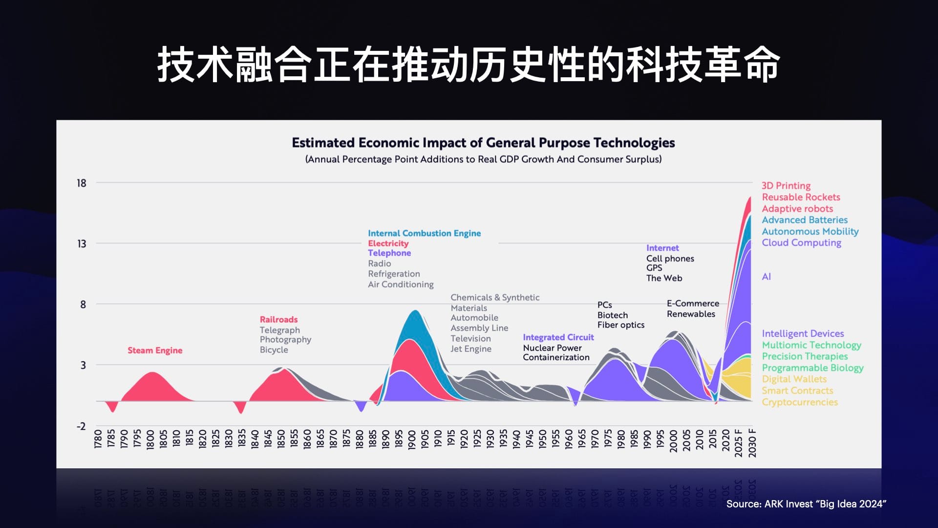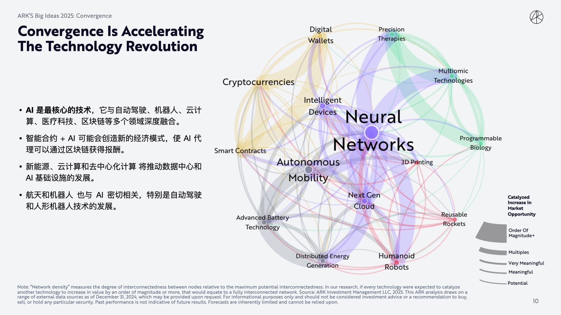 接着,indigo引用了ARK Invest的分析,展示了AI作为核心技术如何催化其他领域的融合与发展。