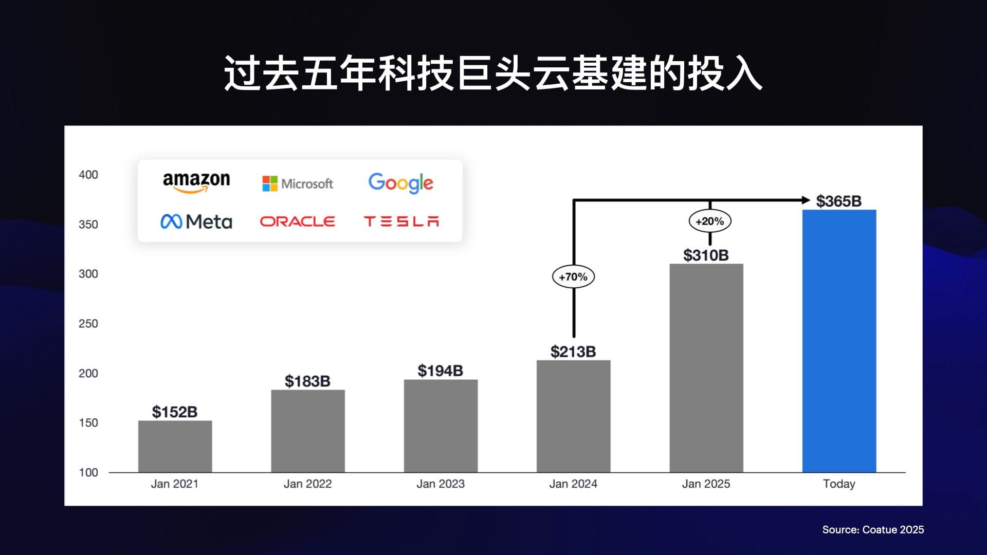 深度阐述 indigo 深入剖析了支撑AI超级周期的硬件基础。他指出,过去五年,科技巨头的云基建投入(CapEx)增长巨大,主要用于“圈地盖数据中心,买 GPU” [00:11:31]。