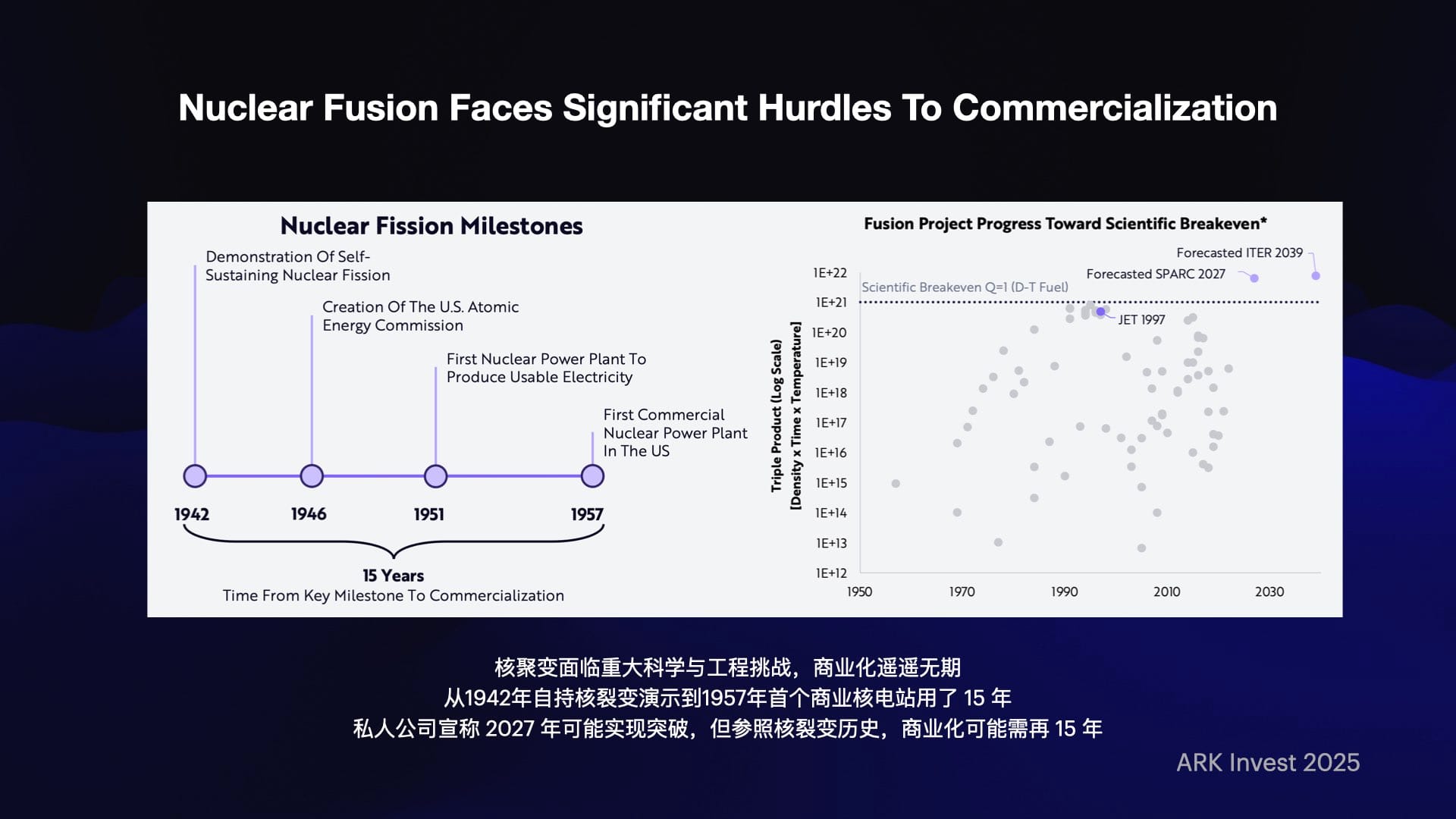 实现这一目标的关键在于“核聚变能搞定” [00:38:25]。indigo分析了核聚变的商业化时间表。