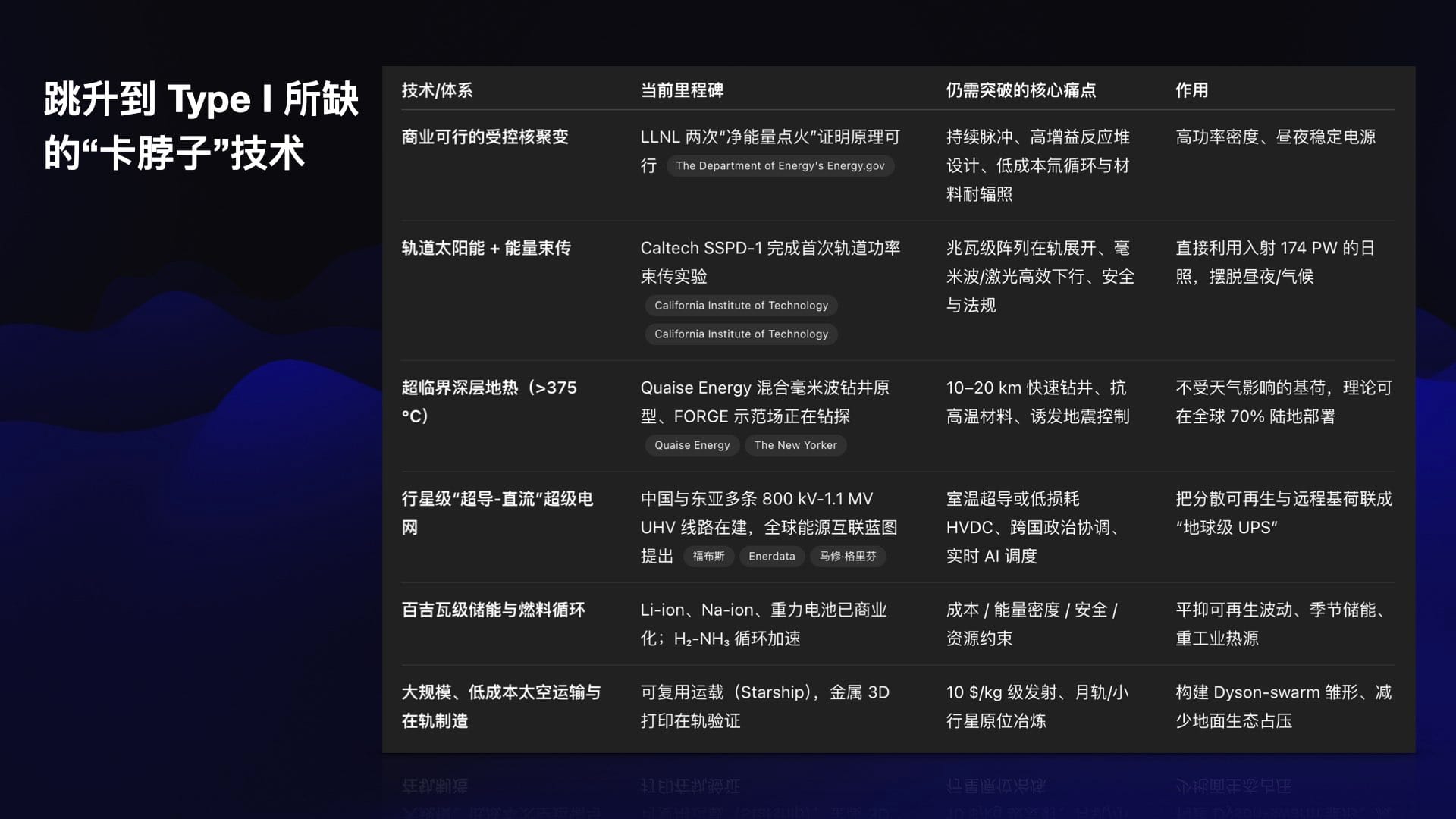 核心观点 实现一级文明的关键在于突破能源瓶颈,特别是可控核聚变的商业化;同时,高效率的能源传输和存储技术,以及对能源密度和稳定性的追求,是支撑AI时代能源需求的核心。
