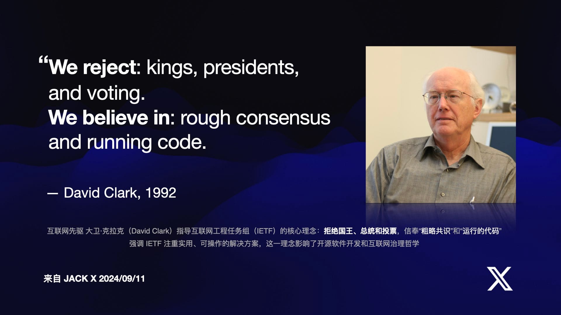 他追溯了这一思想的根源——互联网的治理哲学。引用了互联网先驱戴维·克拉克(David Clark)在1992年的名言:“我们拒绝国王、总统和投票。我们只信奉粗略的共识和运行的代码。” [00:52:24] 互联网和后来的 Crypto(如比特币)都是基于共识和代码运行的去中心化系统。技术共和国试图将这种治理思想应用到现实世界,尽管在地球上可能难以实现,但在“飞地”或火星上或许可行 [00:53:43]。