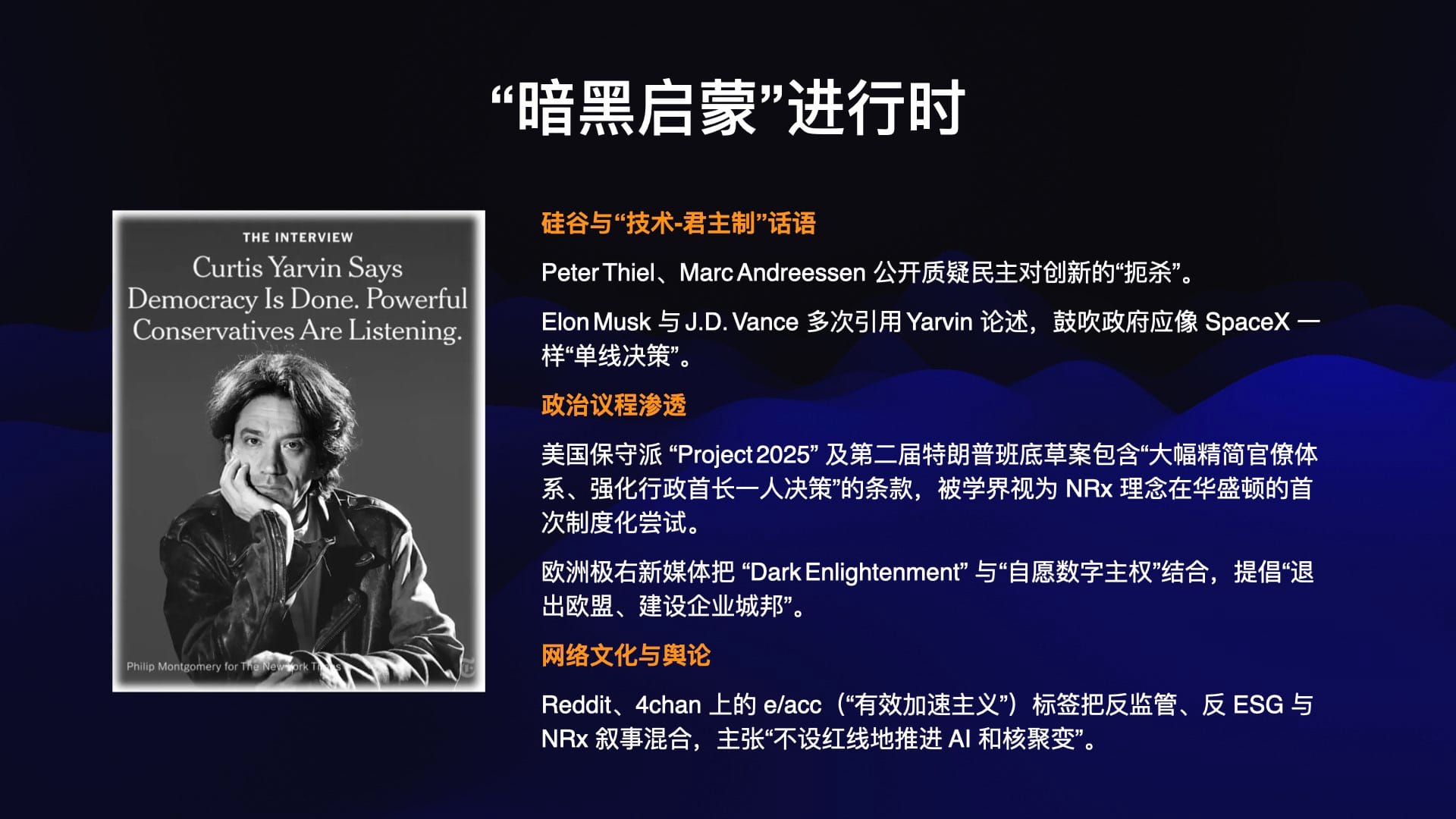 核心观点 科技加速主义不仅影响经济和技术,更在催生新的政治哲学和治理模式,从强调工程师文化和国家能力的“技术共和国”,到挑战现代民主制度、主张精英治理和企业化国家的“新反动主义”(NRX),这些思潮正在深刻地影响现实政治。