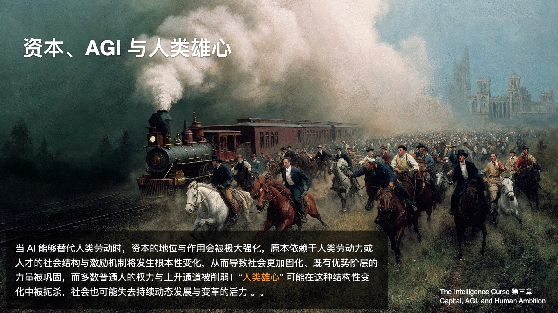 资本、AGI与人类雄心: 他引用了一篇重要文章《Intelligence Curse》(智能诅咒,原题为《资本、AGI、人类雄心》) [00:59:16]。该文的核心观点是:当AI能全面替代人类劳动力时,资本的地位将被强化,而依赖劳动激励的社会机制将失效。这将导致社会更加固化,普通人失去上升通道,最终“人类雄心会被扼杀”,社会失去活力 [00:59:40]。