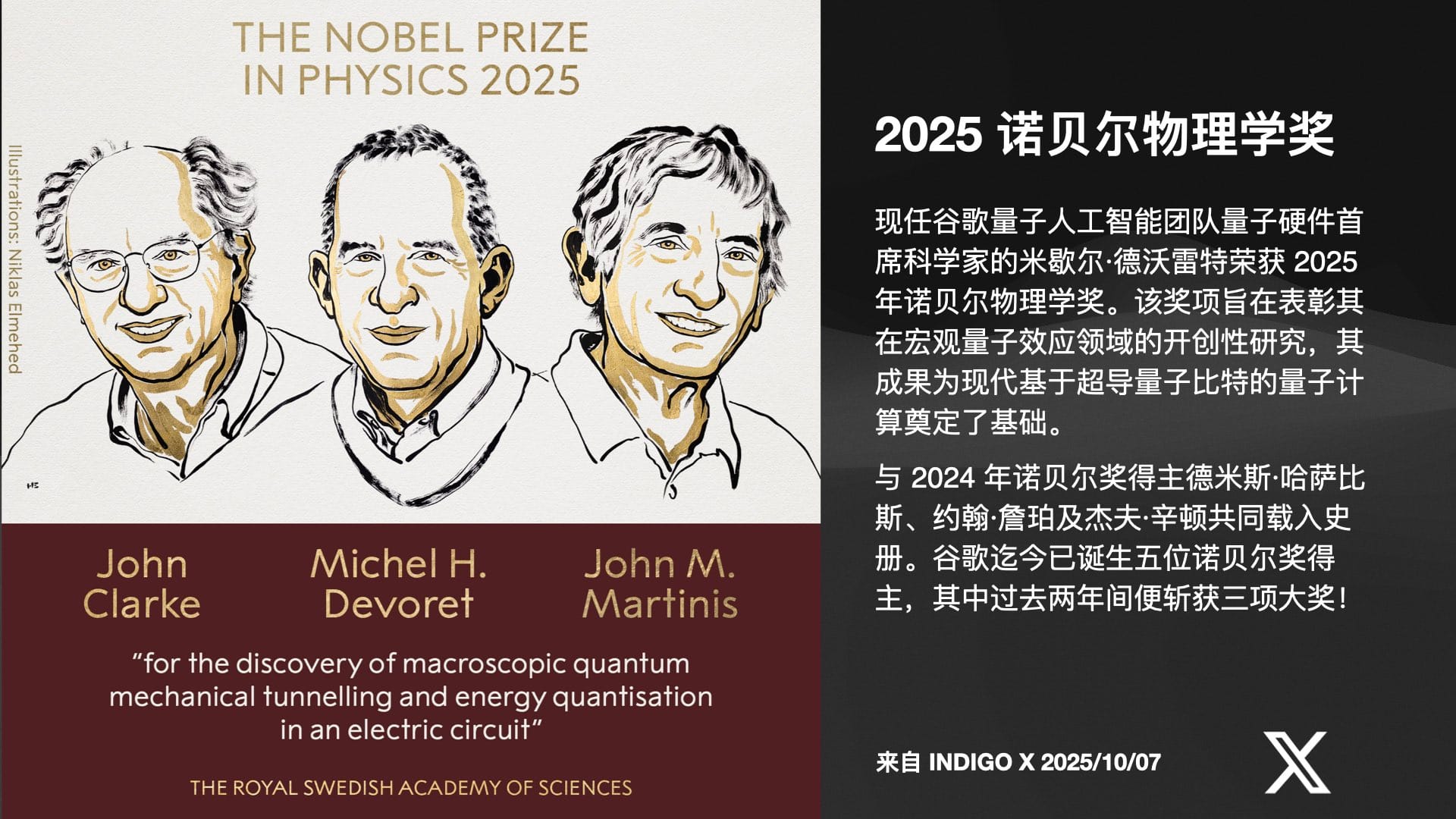 “去年,诺贝尔物理学奖颁给了 AI,给了 Hinton 教授;今年,又颁给了将量子隧穿实验做到宏观世界的 Google 量子计算团队。”