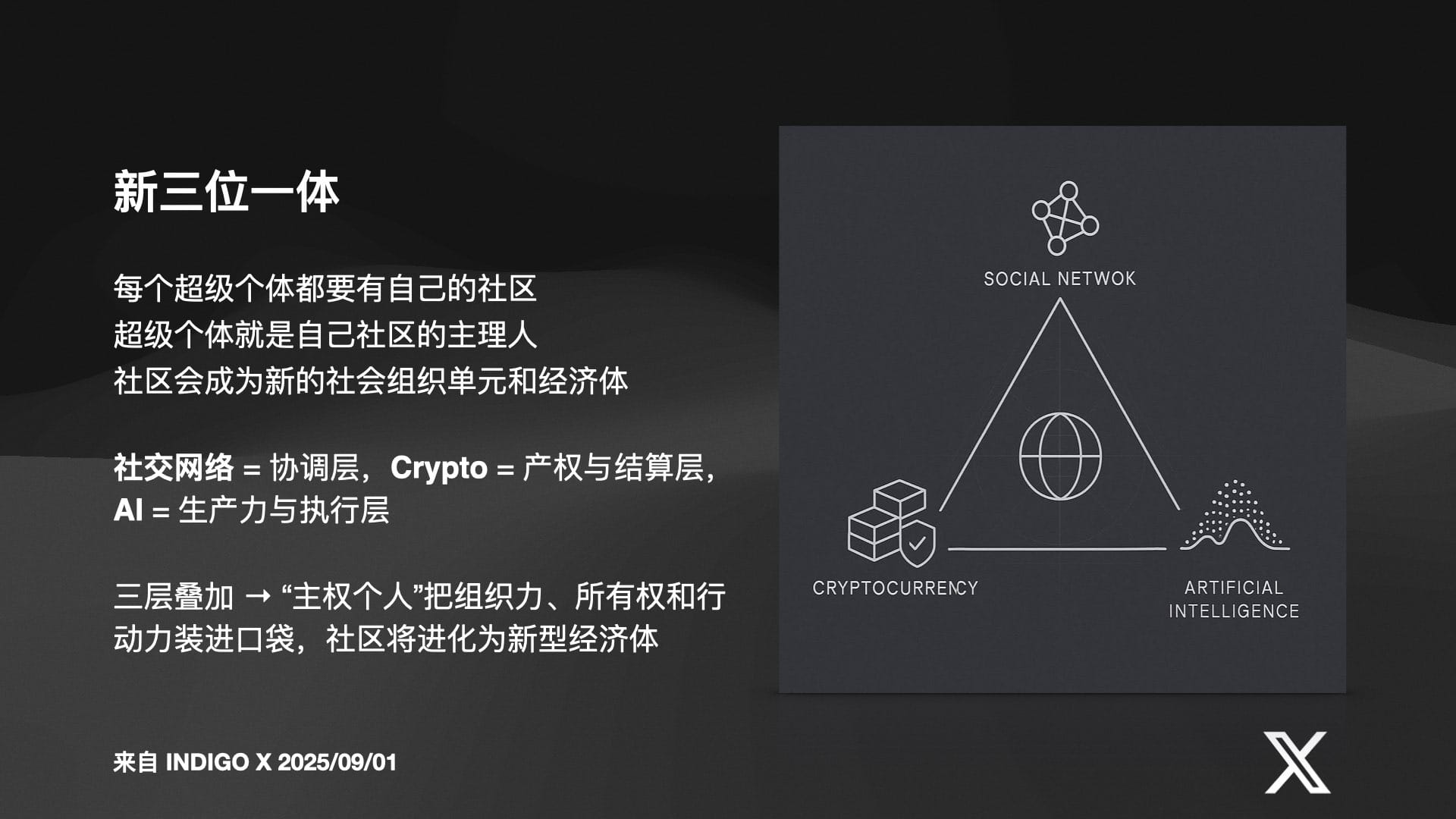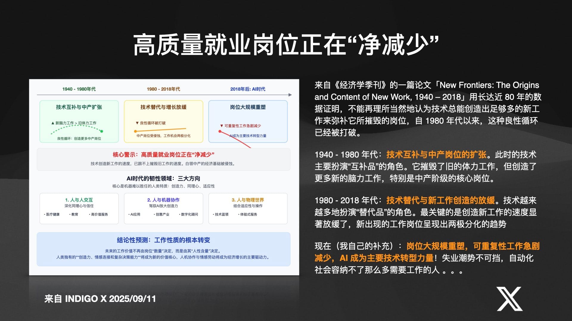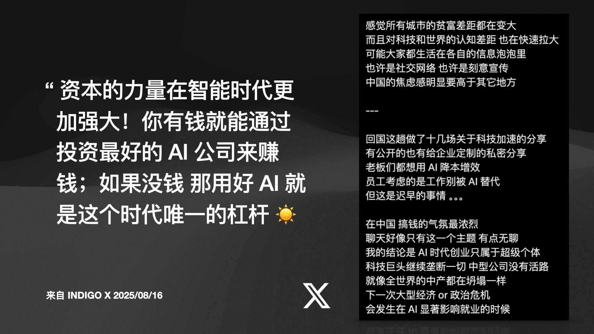 Indigo 的这场直播,不仅是对当前技术浪潮的一次全景式扫描,更是一份充满紧迫感与希望的未来生存宣言。他告诉我们,那个我们熟悉的、稳定的、可预测的世界已经一去不复返。取而代之的,是一个充满不确定性、由资本和智能双轮驱动的加速时代。在这个时代,被动等待意味着被淘汰,而主动学习、积极连接、勇敢地拥抱新工具和新范式,将是通往未来的唯一路径。