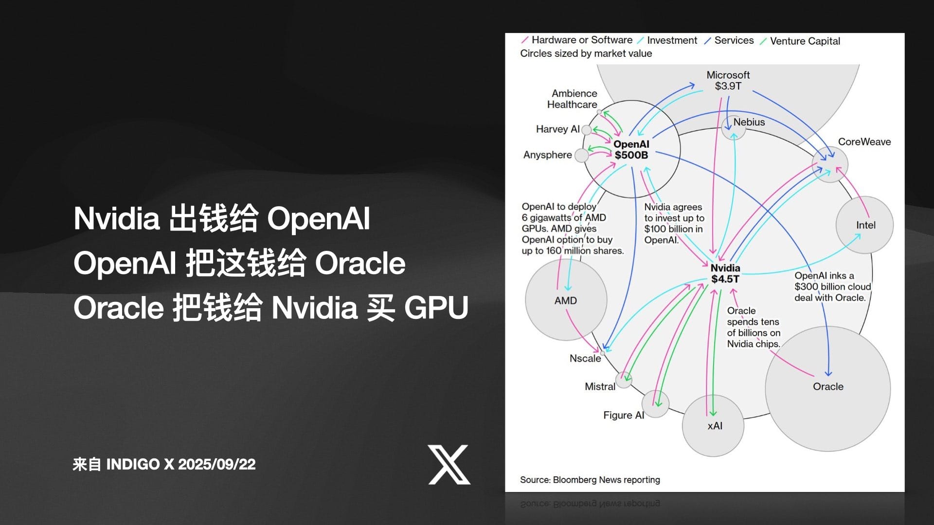 这是一个完美的闭环,Indigo 戏称其为“双脚踩云梯”或“AI 基建黑帮”。这个循环以一种近乎“左手倒右手”的方式,让参与其中的几家公司股价飙升,并创造了真实存在的、庞大的 GPU 订单。