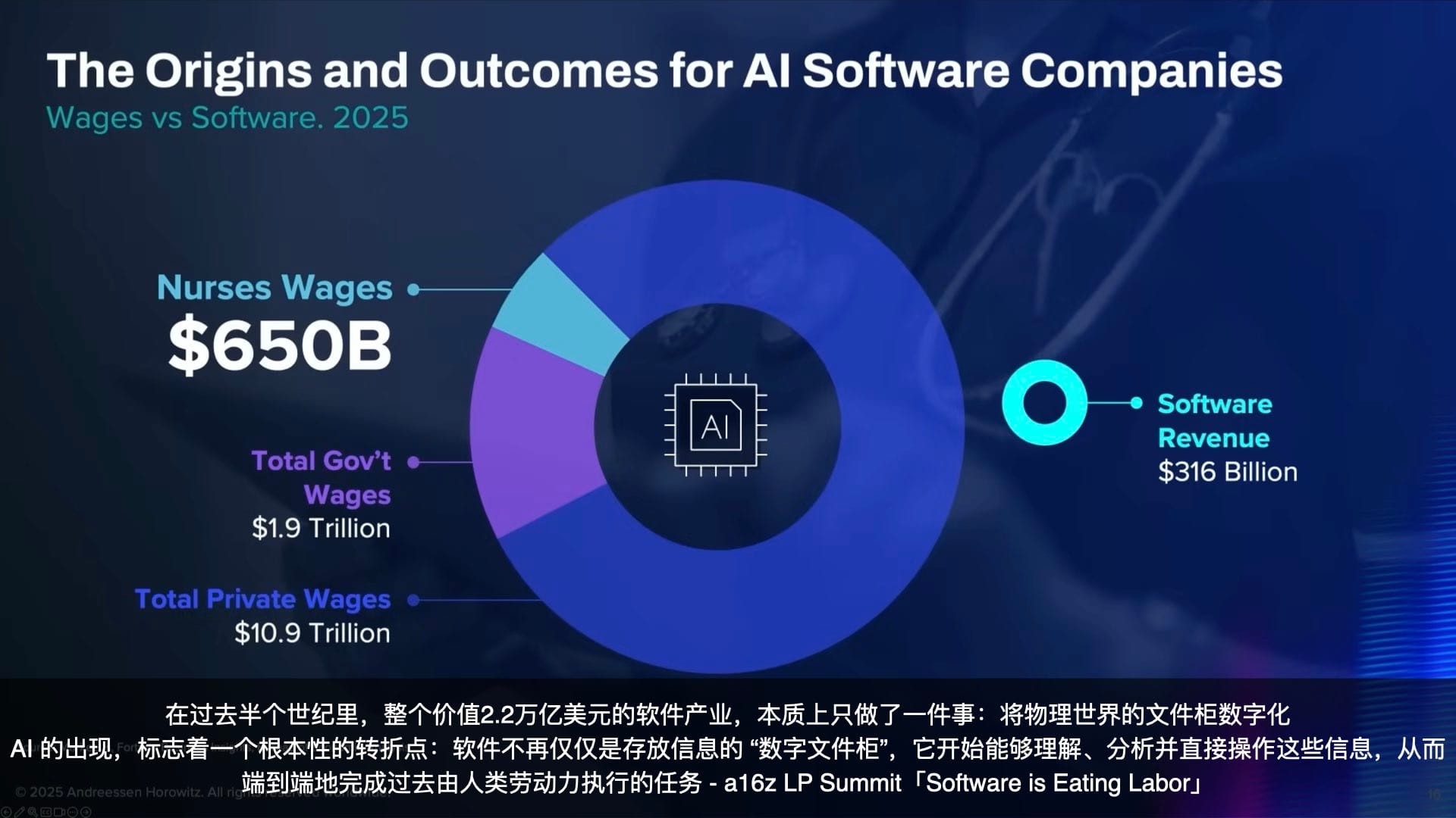 Andreessen Horowitz (a16z) 的一张图则更直观地揭示了这场革命的最终目标。在过去半个世纪,价值约 2.2 万亿美元的软件产业,其本质工作只是将物理世界的资料(文件柜)进行数字化存储和管理(增删改查)。