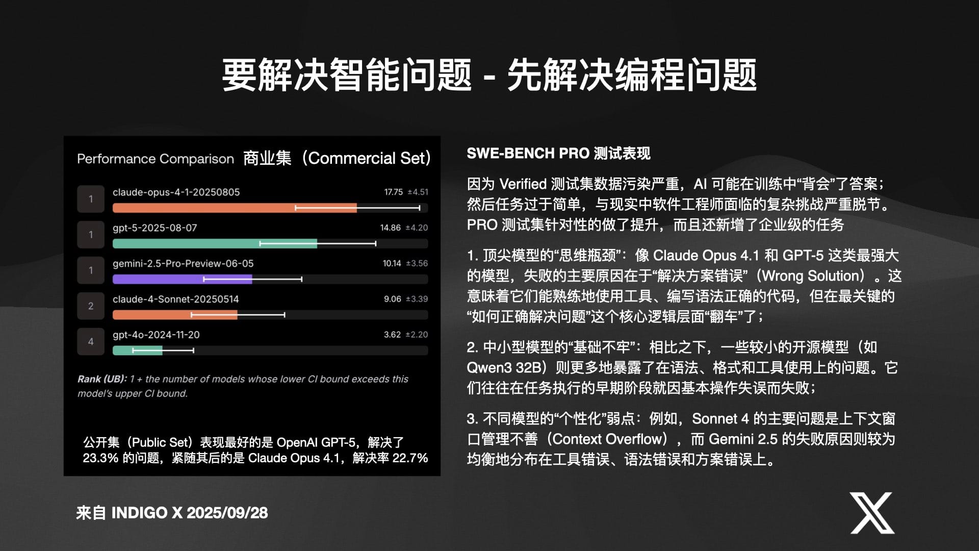 这是当前所有顶尖 AI 公司优先攻克的方向。Indigo 介绍了一个名为 SWE-bench 的权威编程能力测试,它揭示了当前大模型的真实梯队: