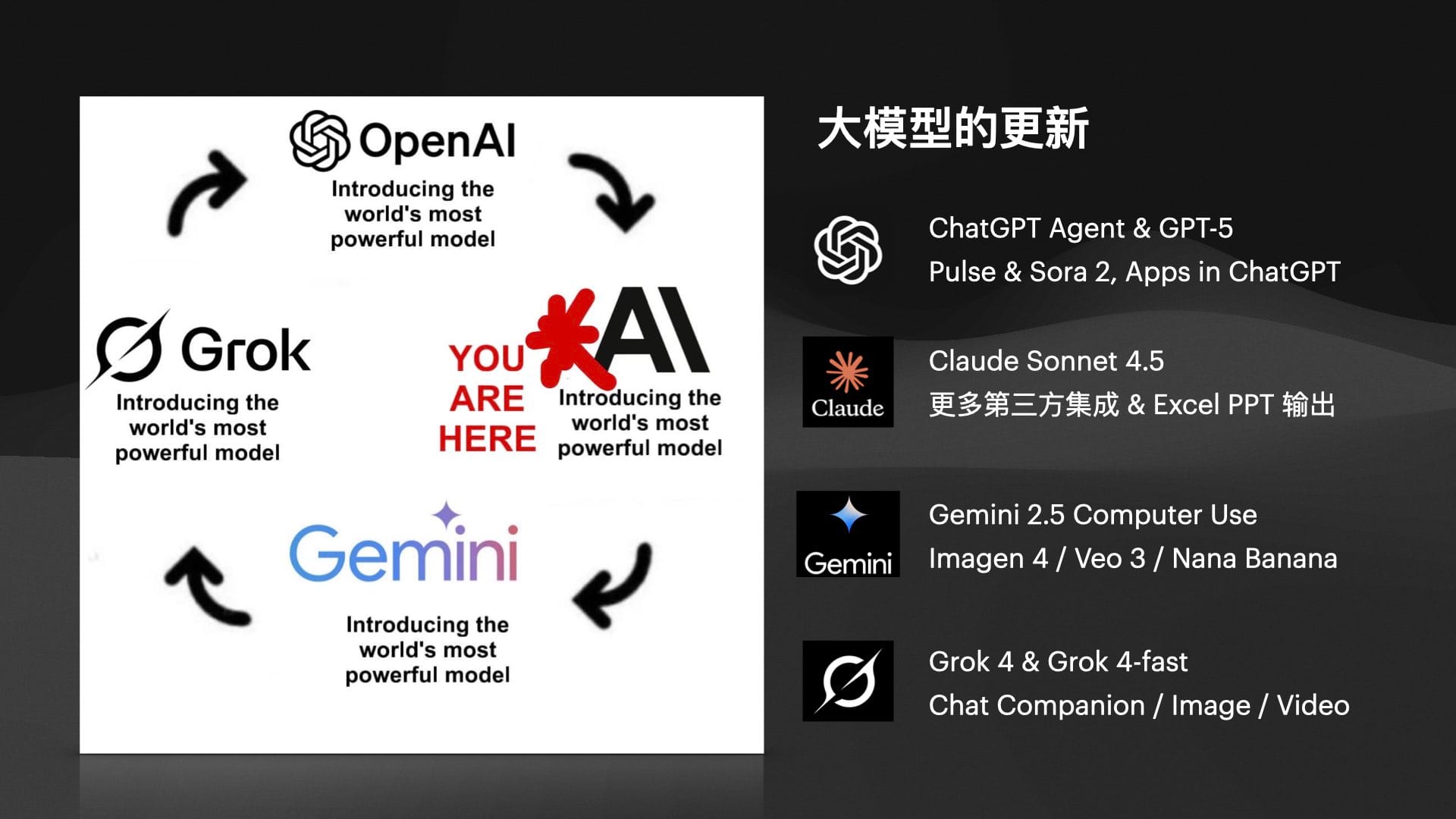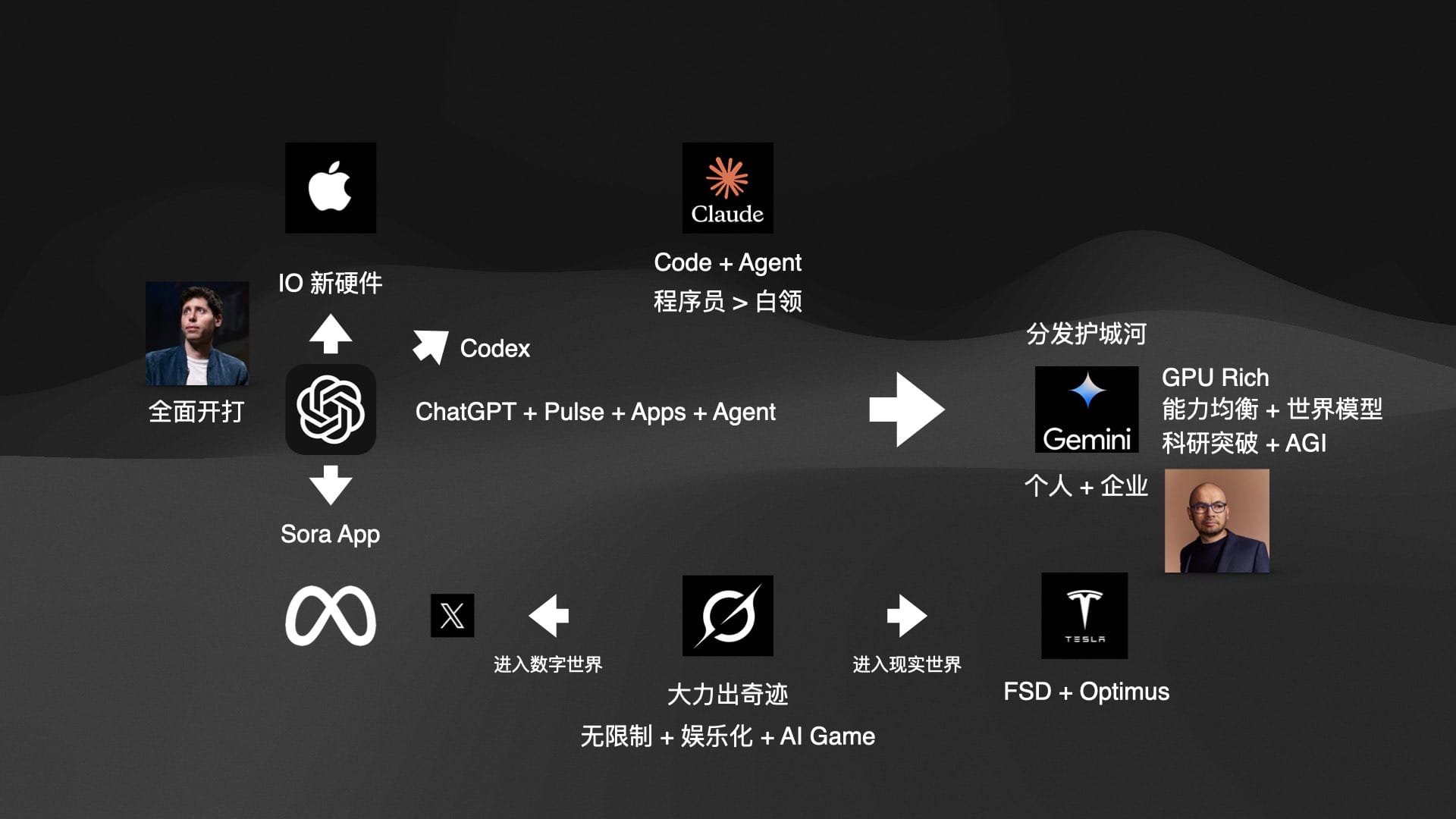 - xAI: 虚实结合的破局者。数字化方向上走娱乐和游戏路线,现实世界方向上则拥有 Tesla 的自动驾驶(FSD)和人形机器人(Optimus)作为独一无二的终端出口。