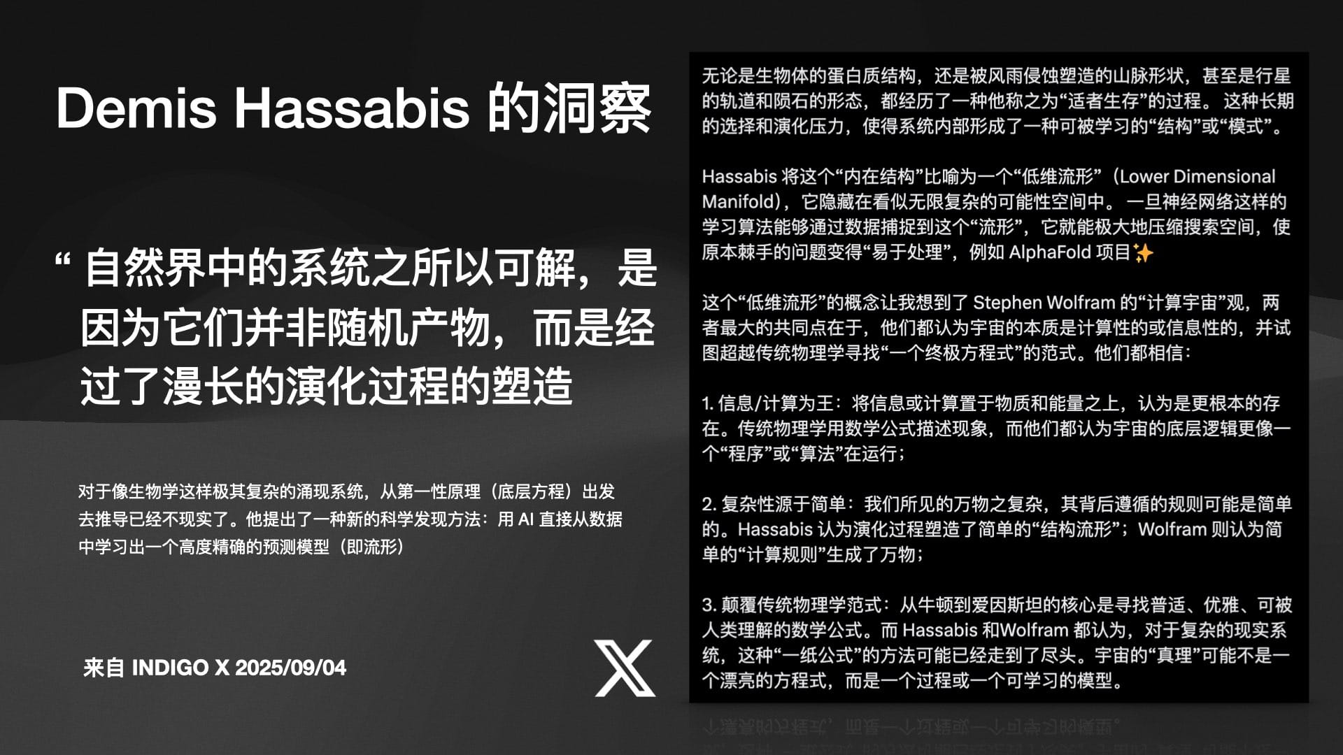 如果说机器人还略显遥远,那么 AI 在尖端科学领域的突破则已是既成事实。Indigo 引用了 DeepMind CEO Demis Hassabis 的一个深刻洞见: