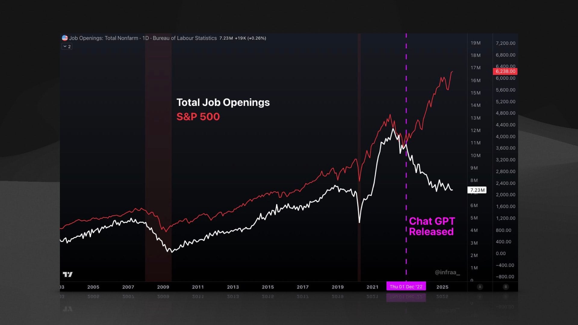 一张图表显示,自 ChatGPT 发布以来,美国的开放招聘职位数量持续下降,而股市却一路高歌猛进。这说明,AI 正在帮助企业在不增加人手甚至减少招聘的情况下,实现利润增长。这正是“AI 吃掉劳动力市场”在宏观数据上的初步体现。