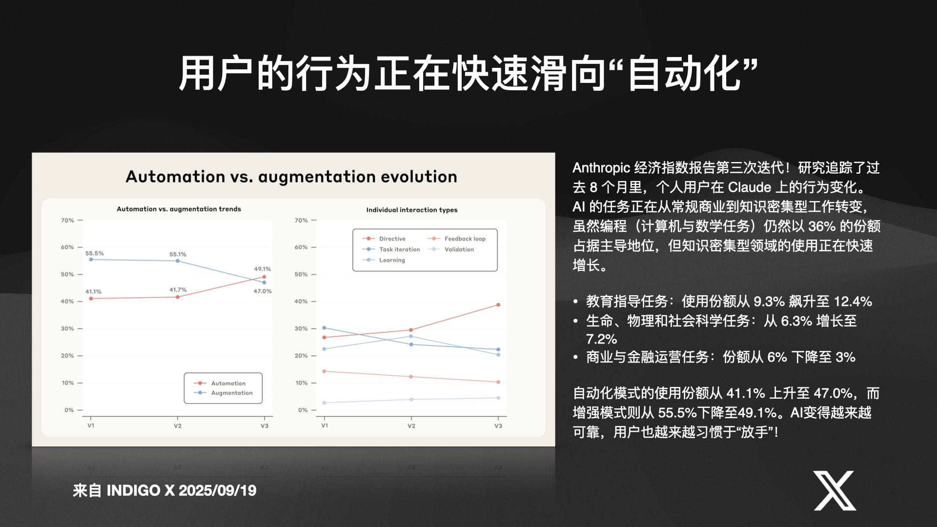 Anthropic 的一份用户行为报告显示,在过去 8 个月里,用户使用 Claude 的模式正在从“增强式”(你问我答)快速滑向“自动化”(放手让 AI 完成整个任务)。这表明,随着模型能力越来越可靠,人类用户正在变得越来越信任和依赖 AI。