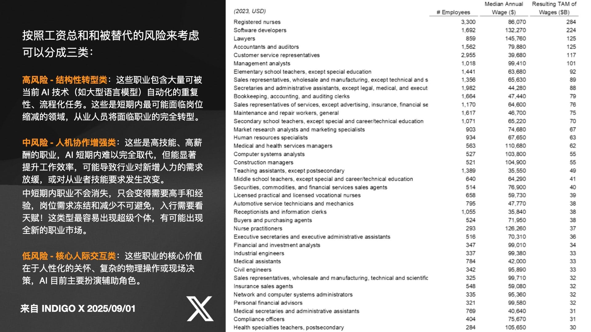 - 中风险(被增强): 需要深度专业知识和创造力的岗位,如高级工程师、分析师、设计师等。AI 将成为他们的强大工具,顶尖人才的效率会得到百倍千倍的提升,形成“超级个体”,但行业的整体招聘需求会冻结甚至减少。