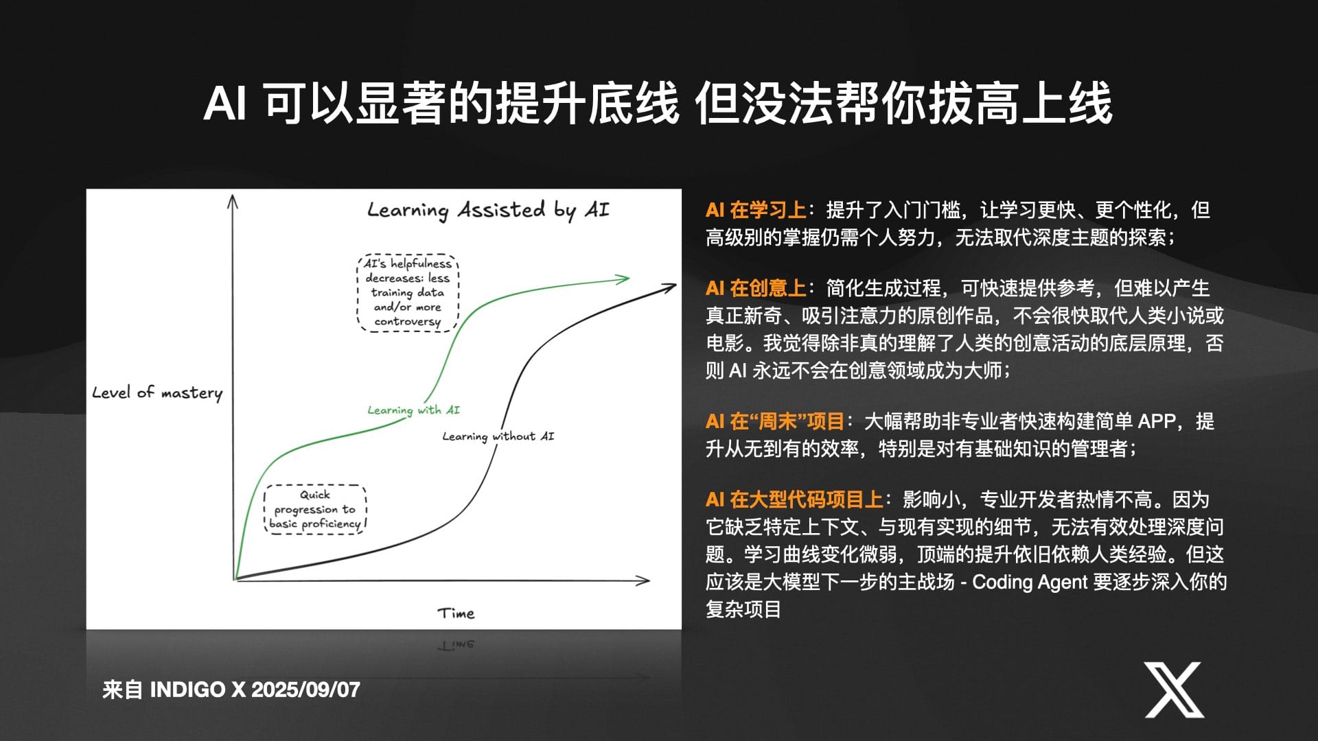 Indigo 的结论是,AI 可以显著提升每个人的“下限”(让新手快速达到可用水平),但无法轻易拔高真正的“上限”(取代大师级的深度思考和创造力)。