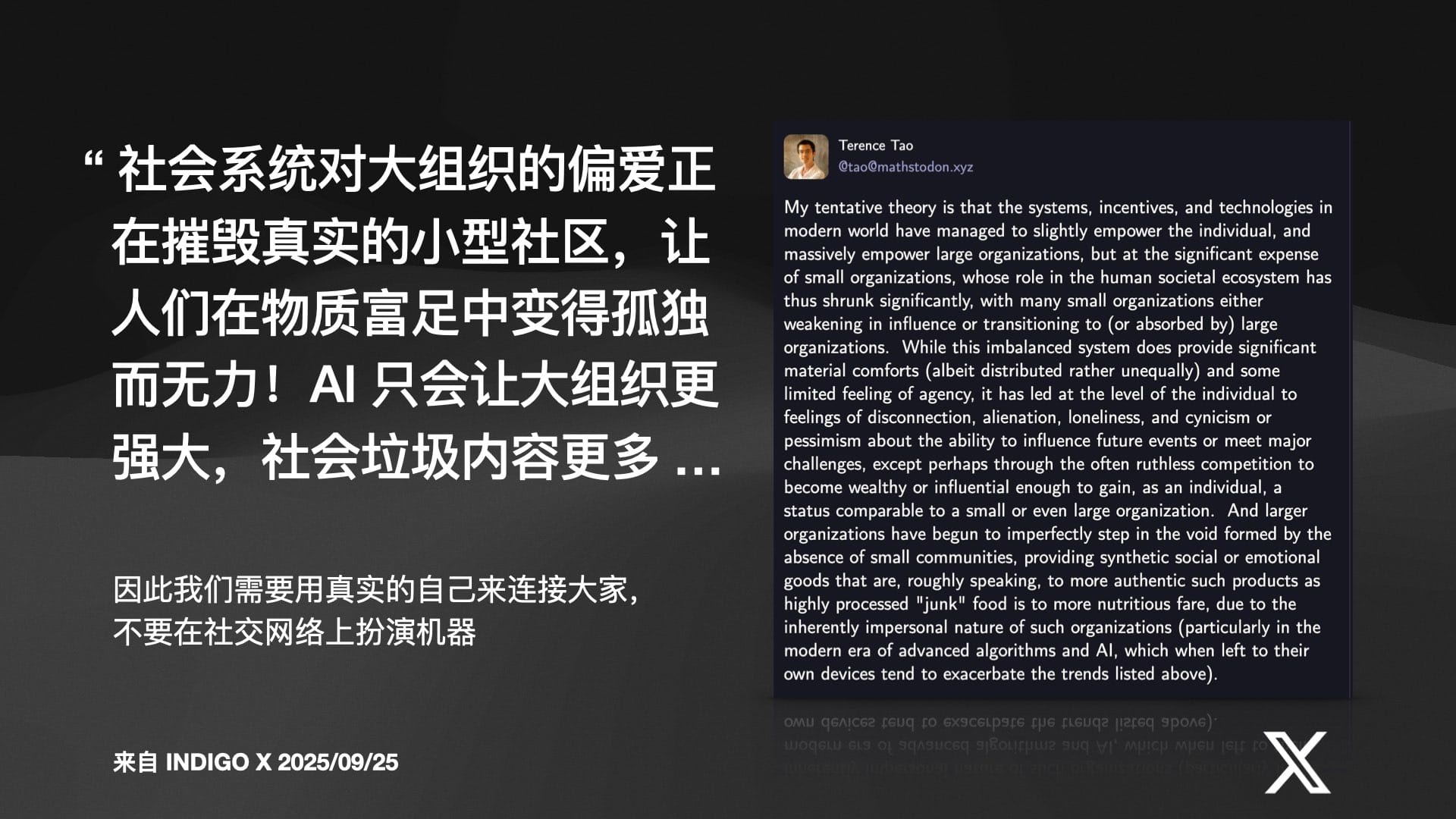 然而,数学家陶哲轩的观察也给我们敲响了警钟:社会系统对大组织的偏爱,正在摧毁真实的小型社群,人们在物质富足中变得前所未有的孤独。AI 的发展,可能会让大公司和算法变得更强大,产生无尽的“内容垃圾”,进一步加剧这种原子化的趋势。