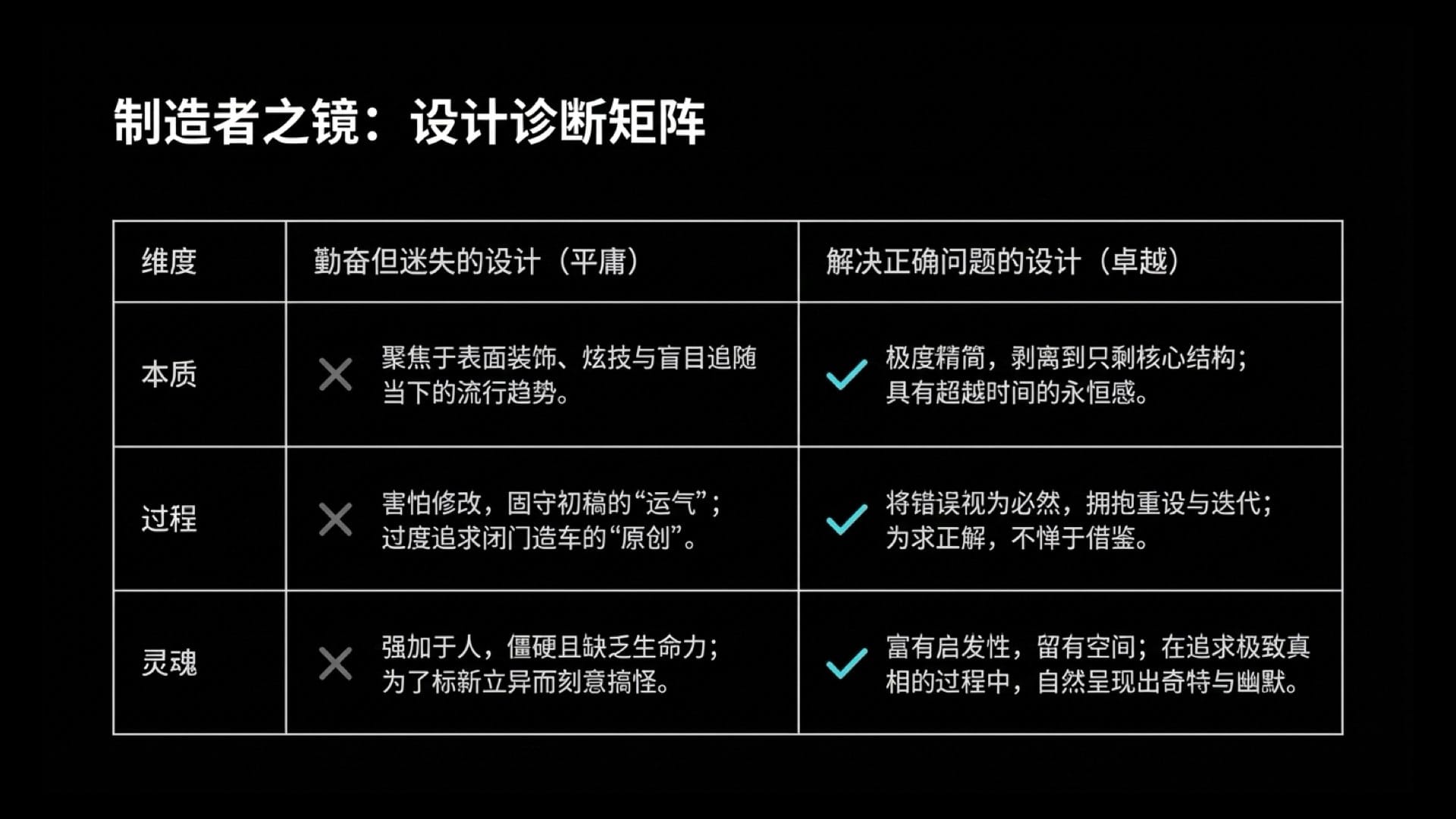 任何人都可以定义自己的"更好",但这个世界里确实有一些事物比另一些更好——更高效、更对称、更精准、更简洁。品位的训练,就是去发现所有工作中那种共同的"美"。