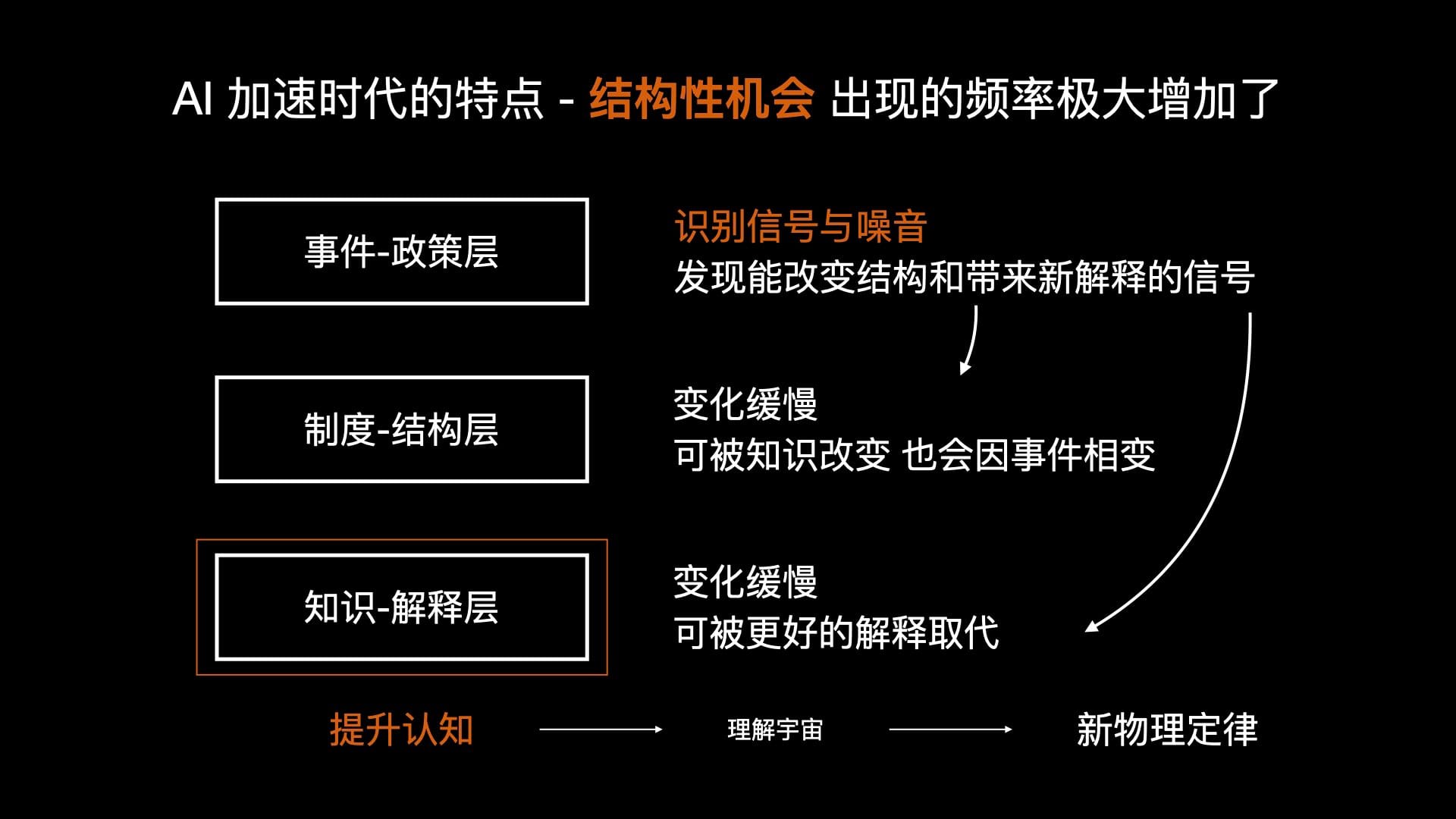 AI 时代的最大特点是结构性机会到处都是,但要分清三个层次——事件层(基本是噪音)、结构层(信号)、解释层(最深层、最慢、最致命)。