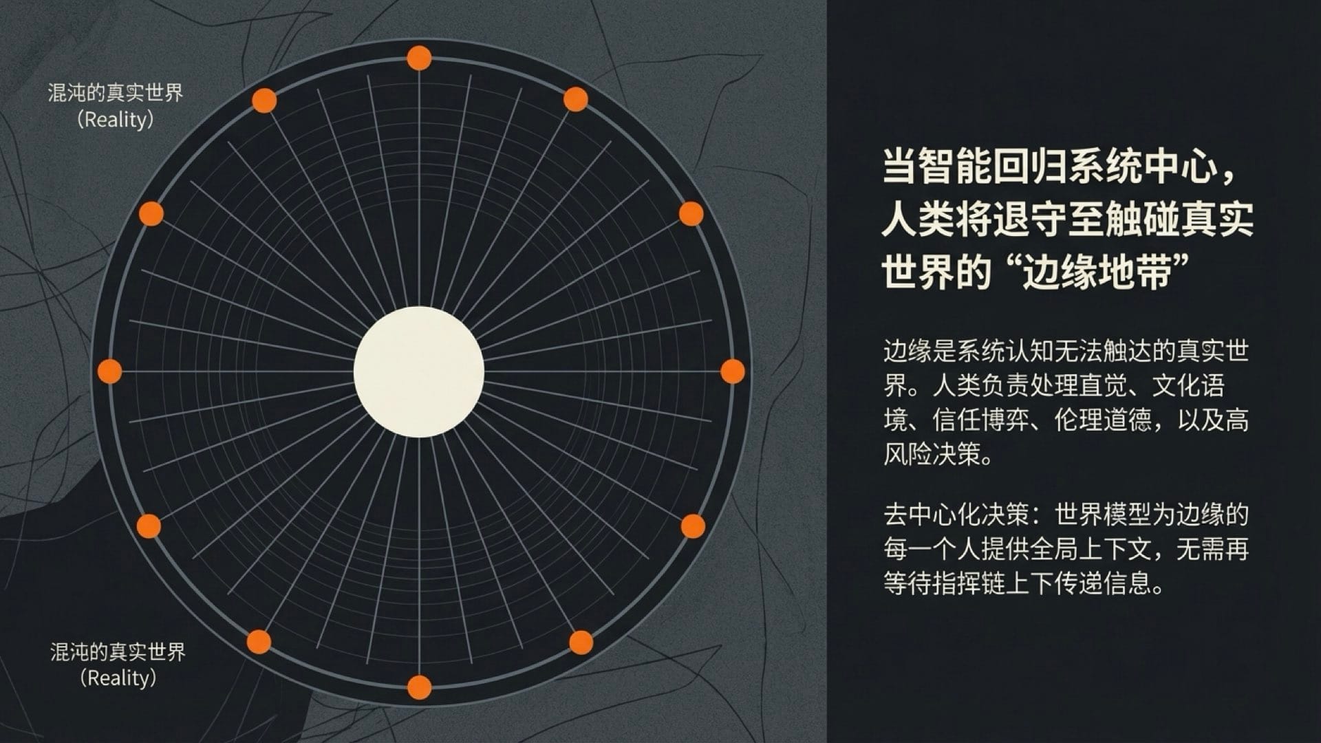 "当智能回归了中心,中间的 AI 协调之后,那人干什么?人就去边缘地带了。人就干——直觉、文化、信任博弈、谈判、伦理道德判断。我们人就做 Social,人就只干一件事情 Social。"