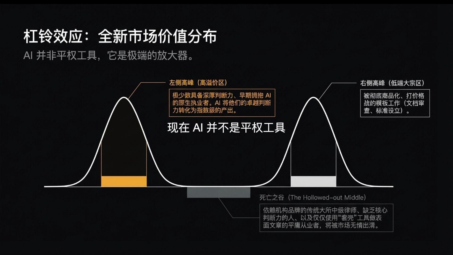 杠铃左端:把 AI 用得最好的高手——最强的创业者、最强的律师、最好的创意人、最有结构的研究者;他们会被 AI 放大成 10 倍乃至 100 倍生产力。