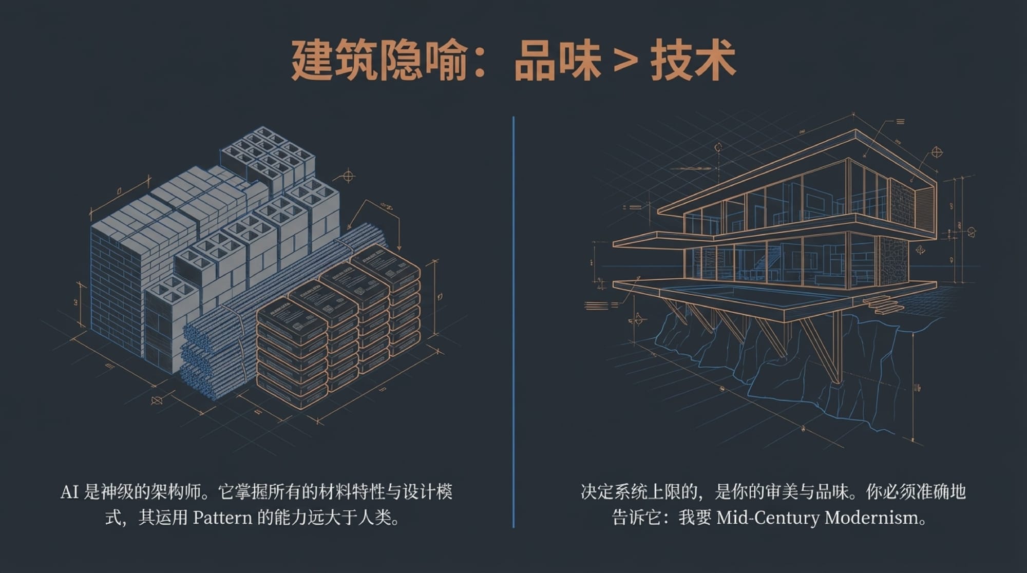 AI Code Agent的架构能力已经是"神般的存在",但要让它做出一流的作品,你自己得有品位。这就像造房子——你不需要知道怎么设计,但你得有审美。