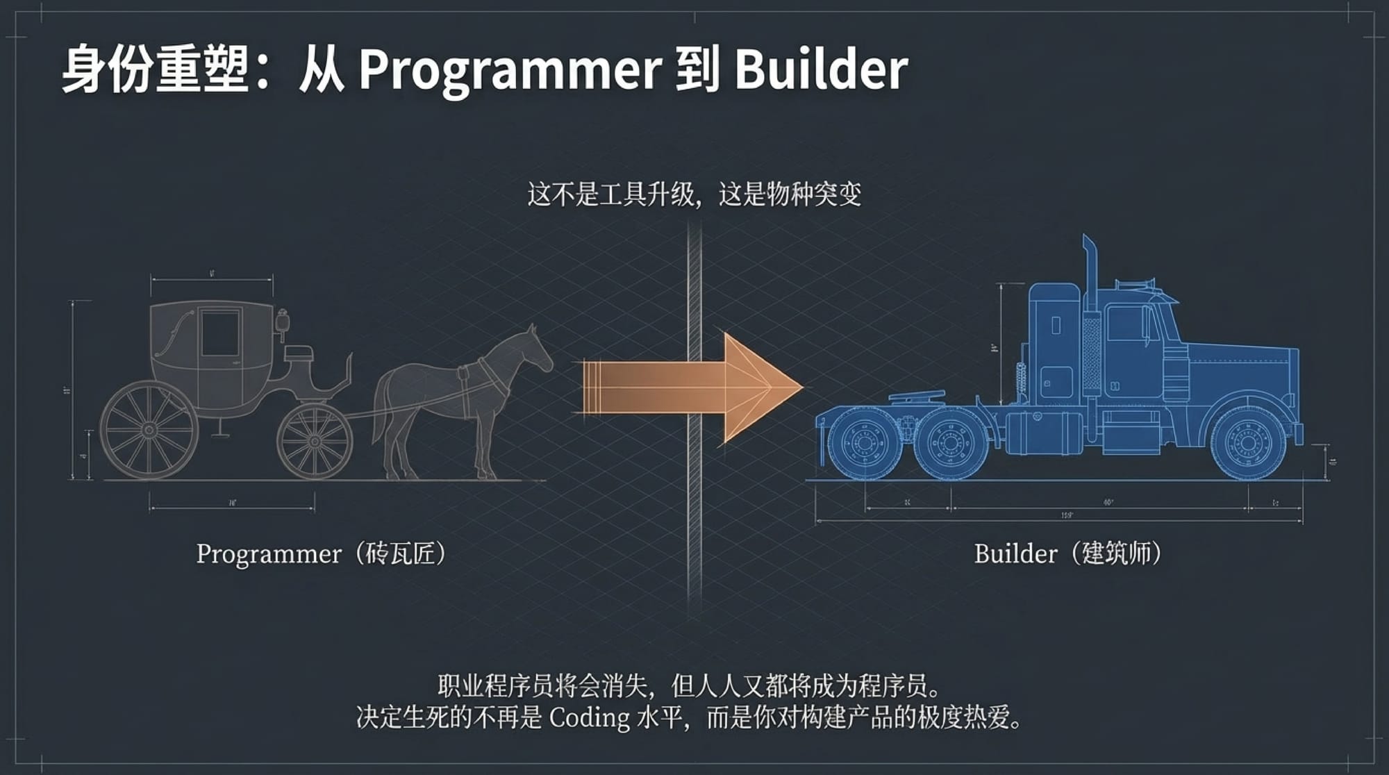 他用了一个特别生动的比喻来形容这个行业变迁:从马车到重型卡车。历史上从马车到汽车,赶马车的人失业了。但汽车从汽车到重型卡车,赶马车的人也无法直接开重卡——这需要完全不同的技能。今天的AI编程也是如此:不是"马车变成了更快的马车",而是一种全新的物种出现了。