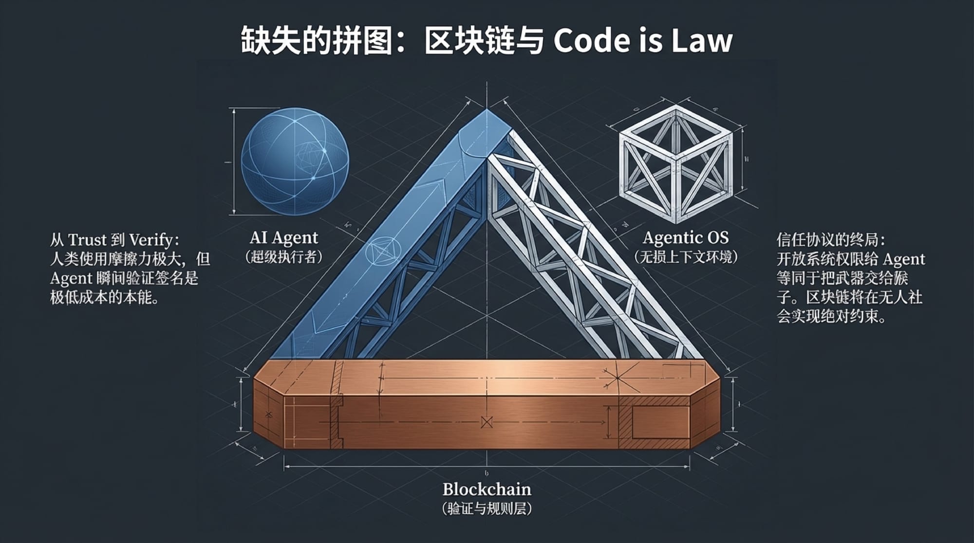 区块链的核心价值是什么?是 Verification(可验证性)——Don't Trust, Verify。在人类经济中,Trust(信任)是最高成本的东西。区块链通过密码学让验证变得快速和低成本。过去人类用区块链的时候,虽然技术上可以自己验证签名,但绝大多数人(包括老冒自己)从来没真正手动验证过——我们只是"相信程序,相信钱包"。但 AI Agent 可以真的去验证:立刻写一段代码来验证签名是不是对的,全部搞得定。
